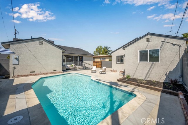 This beautiful, fully permitted, Remodeled Pool Home boasts 3 bedrooms & 3 baths. With an elegant & sophisticated feel, this home has it all - living room, dining room, sparkling pool & pool bathroom, primary suite, indoor laundry and a kitchen any chef would love. New Roof! Enjoy the shimmering pool- updated with new plaster and tile, new drain and return lines, new light and new plumbing to pool equipment. The primary suite is gorgeous with 2 closets, linen closet, an attached bathroom with a dual sink vanity, curbless shower with frameless shower door & designer touches. The newly remodeled kitchen has modern cabinetry, new appliances, quartz countertops, butcher block accent, pantry & elegant tile backsplash. And the accent wall in dining room-simply fantastic! Newly painted interior and exterior. New LVT flooring. Newer HVAC. Dual-pane windows. Upgraded plumbing & electrical. Beautifully landscaped. New LED lighting throughout, new interior & exterior doors, new base molding, new door and window casings, new hardware throughout, new fixtures throughout. New garage door & opener. Welcome Home!
